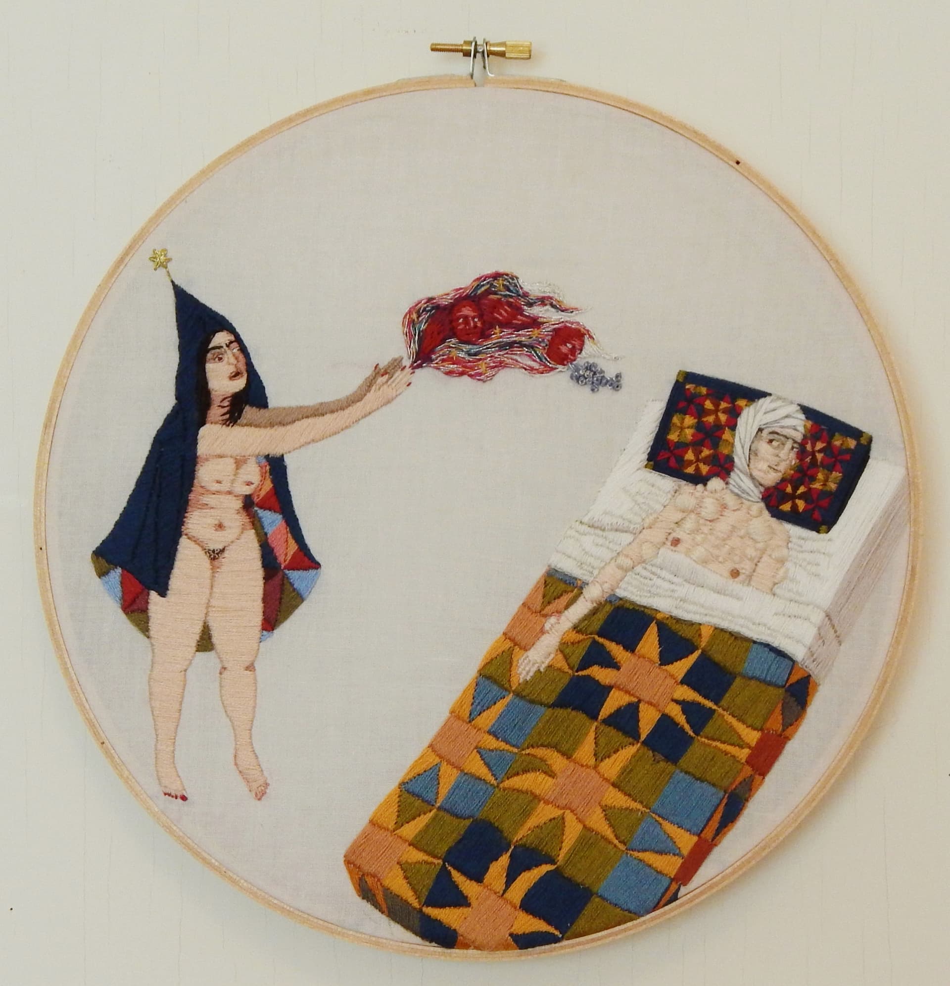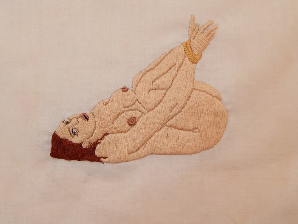 FQ: Your work is very much centered on pleasure and the erotic. Is there a specific aspect of human sexuality you are particularly interested in? Do you think embroidery lets you explore this in a way you couldn't otherwise? AV: For me, the pieces are always somewhat autobiographical, so the female characters are always the center of the work, and I never realized until it was pointed out that in the erotic pieces in particular the women are always dominant. I prefer strong females, so if they're expressing eroticism I want them to be the subject, not just another object. In this way, I find my work resonates within the feminist community, and I think the medium of embroidery definitely lends itself to that, it adds a new dimension to the work. For me, embroidery is so exciting because it's still so steeped in tradition, for a while I was bored with art—I felt like everything's already been done—but subverting this medium feels joyful. It's made art fun again, and in a corny way I feel like I'm part of this long and storied sisterhood.